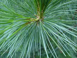 Иголки трёхгранные прямые, длиной 7—10 см, шириной 0,75—1 мм; жёсткие, зелёные или серо-зелёные, заострённые на концах, со светлыми устьичными полосками с обеих сторон. Собраны в пучки по пять штук. Боковые края игл редкозубчатые (10—11 зубцов на 1 см).