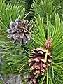 Мужские шишки эллипсоидные либо цилиндрические, 5-15 см длиной, оранжево-красные. Женские шишки асимметричны, конусообразные или яйцевидные перед раскрытием, широкояйцевидные или шаровидные после раскрытия, (2-)3-6(-7,5) см длины, желтовато-коричневые или бледно-красно-коричневые, блестящие, почти бесчерешковые либо на короткой ножке 2-3 мм, созревают через 16-20 месяцев, поздноцветущие (долго остаются закрытыми), обычно расположены пучками. Апофизы почти ромбовидные, по-разному удлинённые, с перекрёстными килями, часто усеяны бугорками по направлению к внешней стороне; выступ расположен в центре, вогнуто-треугольный; шипы слегка растянуты либо приплющены, до 6 мм. Семена сдавленные, яйцеобразные, до 5 мм, чёрные (бесплодные семена часто слегка покрыты беловатыми либо красно-коричневыми крапинками); крыло 10-14 мм.