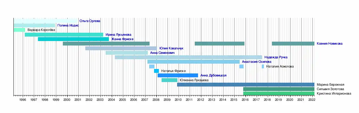 | 3. | Варвара Королёва | 1995—1996 | 1 год | 1.Ирина Лукьянова 2.Жанна Фриске |