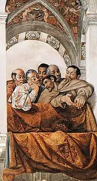 ![]() Хасэкура Цунэнага, подперев голову рукой, ведёт беседу с переводчиком Луисом Сотело. Фреска в Квиринальском дворце, Рим. | |