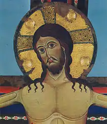 На кресте изображён Христос в позе Christus Triumphans, то есть Христос торжествующий, победивший смерть. В верхней части креста располагается Христос в мандорле и четыре ангела, на табеллоне справа и слева от туловища Христа — Богоматерь и Иоанн Креститель, у основания креста покоится череп Адама, олицетворяющий первородный грех, который искупил своей смертью Иисус Христос. Все изображения написаны на пергамене, наклеенном на деревянную основу. Крест является вторым, после креста мастера Гульельмо, точно датированным распятием в итальянской живописи XII века.