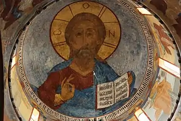 Первоначальная кирпичная алтарная преграда (в настоящее время скрыта иконостасом XVIII века) выложена заподлицо с западными гранями восточной пары столпов.
