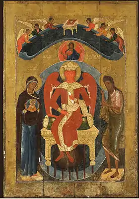 Главный престол был освящён в 1612 году в честь Софии Премудрости Божией Слова[12]. София — понятие христианской философии, аллегорический образ и, одновременно, личностный персонаж, тождественно близкий к божественному «Я», представление олицетворённой мудрости Бога.