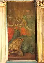 В углублённой арке на северной стене жертвенника находится фреска редкого сюжета — «Поминовение усопших». Под ней было обнаружено донаторское место, где должен быть погребён вкладчик храма, то есть Иван Грозный[26].