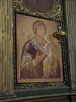 …Максимом Искрицким не дописано во оной соборной церкви живописною работою святых образов в первом апартаменте вместо старых местных вновь местных же четыре, а имянно: Спасителев, Софии Премудрости Божий, Воскресение Христово, на одной деке триех святителей Василия Великого, Григория Богослова, Иоанна Златоустаго, да на правой стране в местных же круг прежних дву образов богородичных Успения Пресвятыя Богородицы и Одигитрия карниз в чюдесех и двои пономарские двери, в пророческом и праотеческом апартаментах в откосах четыре образа малых, а каковыми лицами писать надобно, о том каковое повеление будет. А из вышеписанных местных прежних два образа — Спасителев и Софии Премудрости Божий — имеются весма хорошего и твердого писма и ничем не повредились[25].