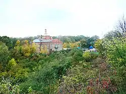 По левую сторону от церкви находится корпус монашеской трапезной. Он интересный тем, что со стороны монастырского двора кажется одноэтажным, а если подойти ближе двухэтажным. Зрительный эффект обусловлен тем, что трапезная расположенная на холме.