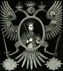 В последние годы правления Софьи проявляется явное желание её окружения устроить царевне «помазанье на царство» с тем чтобы сделать её самодержавной правительницей, равной по статусу её братьям. С этой целью рассылались послы в стрелецкие полки, иностранные дворы и к Вселенским патриархам[34][35][36][37]. С 8 января 1686 года имя Софьи Алексеевны стало включаться в царский титул, её официально начали именовать самодержицей[38][39]. Стали появляться золотые монеты с изображением Софьи, были созданы портреты царевны в полном царском облачении со скипетром и державой в руках на фоне двуглавого орла[40]. Под портретом печатался полный царский титул и стихи о её добродетелях, которыми царевна «царство аки седми столпы укрепила»[41]. Портреты правительницы стали распространяться при помощи специальных политических плакатов. К лету 1689 г. несколько сот плакатов с портретом Софьи были распространены по Москве и посланы за рубеж[36]. Сочинялись поддельные акты о «всенародном и единогласном» избрании Софьи правительницей России в мае 1682 года[36].