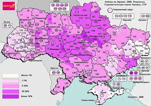 Максимальную поддержку социалисты получили в Центральной Украине: Винницкая область (14,69 %) и в городе Мариуполь Донецкой области (18,44 %). Минимальная поддержка СПУ была зафиксирована в Луганской области (1,17 %) и Севастополе[10].