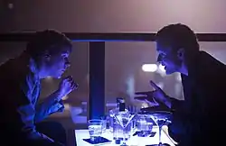 Ещё одна технически сложная сцена — ночной клуб, где Паркер проповедует Цукербергу своё видение будущего социальной сети. Всё начинается с того, что гигантский кран переносит камеру со второго этажа клуба на первый и затем обратно на второй, разворачивая её там на 180 градусов и создавая у зрителя ощущение лёгкого головокружения. В соответствии с демоническим характером Паркера режиссёр хотел придать этой сцене едва уловимый налёт зловещего[20]. С этой целью прямо в стол, над которым заговорщически склоняются плохо слышащие друг друга из-за музыки герои, были вмонтированы светодиодные табло, позволяющие транслировать многоцветные фильмы[20]. Загадочная подсветка героев снизу призвана вызвать у зрителя чувство психологического дискомфорта.