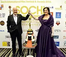 Марина Вартазарян вручила президенту SIFFA Любови Балаговой специальный приз мэра Сочи за выдающиеся достижения в области кино и значительный вклад в укрепление репутации Сочи как международного центра кинематографии – скульптуру двуглавого овна.