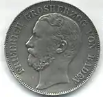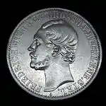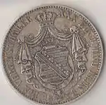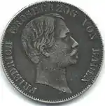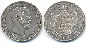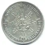 MÜNZVERTRAG VOM 24 JANUAR 1857 (рус. Монетный договор 24 января 1857 года) | Великий герцог Бадена Фридрих | Герб Бадена, круговая надпись «EIN VEREINSTHALER XXX EIN PFUND FEIN» | 1865—1871 | Карлсруэ | Суммарно[коммент. 6] — 706 690[24] |