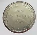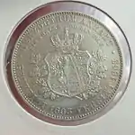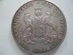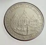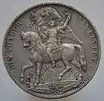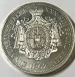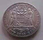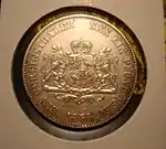 30 EIN PFUND F. ~ • ~ EIN THALER ~ • ~ | Король Ганновера Георг V | Круговые надписи «Eala Frya Fresena» и «ZUR ERINNERUNG AN DIE FEIER DES 15. DEC. 1865» (рус. В память о празднике 15 декабря 1865). В середине расположен дуб под которым стоит рыцарь в доспехах с копьём и мечом | 1865 | Ганновер | 2 000[40] |