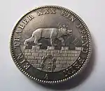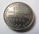 GOTT SEGNE ANHALT (рус. Боже благослови Ангальт) | Центральная надпись «SEGEN DES ANHALT BERGBAUES» (рус. Из благ рудников Ангальта), круговая надпись «ALEXANDER CARL HERZOG ZU ANHALT» (рус. Александр Карл герцог Ангальта) | В центре часть крепостной стены на которой расположен медведь в короне, круговая надпись «EIN VEREINSTHALER XXX EIN PFUND FEIN» | 1861—1862 | Берлин | Суммарно[коммент. 1] — 30 000[13] |
