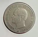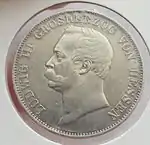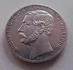 * * * XXX * EIN * PFUND * FEIN | Король Баварии Максимилиан II, под изображением знак медальерного мастера J. RIES | Сидящая женщина с венком и рогом изобилия. Рядом лавр. Круговая надпись «DURCH KAMPF UND SIEG ZUM FRIEDEN» (рус. Через борьбу и победу к миру), внизу «FRIEDENSSCHLUSS ZU FRANKFURT A. M. 10 MAI 1871» (рус. Мирный договор во Франкфурте-на-Майне 10 мая 1871) | 1871 | Мюнхен | 149 584[19] |