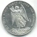 * * * XXX * EIN * PFUND * FEIN | Король Вюртемберга Карл I. Внизу изображения знак медальерного мастера «C. SCHNITZSPAHN» | Ангел с пальмовой ветвью над военными трофеями посреди которых два лавровых венка с цифрами 1870 и 1871. Цифры обозначают годы франко-прусской войны. Полукруговая надпись «MIT GOTT DURCH KAMPF ZU SIEG UND EINIGUNG» (рус. С Божьей помощью через борьбу к победе и объединению). Внизу и слева знак медальерного мастера «C. SCH. F.» | 1871 | Штутгарт | 113 674[36] |