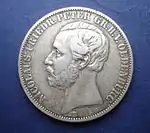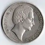 GOTT SEGNE BAYERN (рус. Боже благослови Баварию) | Король Баварии Людвиг II. От следующего монетного типа отличает наличие пробора. Под изображением монарха знак медальерного мастера Карла Фойгта C. VOIGT | Герб, который держат два стоящих на задних лапах льва, круговая надпись «EIN VEREINSTHALER XXX EIN PFUND FEIN» | 1864—1866 | Мюнхен | Суммарно[коммент. 4] — 4 385 128[21] |