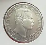 GOTT SEGNE ANHALT (рус. Боже благослови Ангальт) | Герцог Ангальта Леопольд IV Фридрих | Герб, по бокам которого расположены две дубовые ветви. Две круговые надписи, внешняя «HERZOGTUM ANHALT GETHEILT 1603 VEREINT 1863» (рус. Герцогство Ангальт, разъединено в 1603, воссоединено в 1863), внутренняя «EIN THALER 30 EIN PF. F.» | 1863 | Берлин | Суммарно — 20 300[15] |
