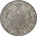 MÜNZVERTRAG VOM 24 JANUAR 1857 (рус. Монетный договор 24 января 1857 года) | Великий герцог Бадена Фридрих | Герб Бадена, круговая надпись «EIN VEREINSTHALER XXX EIN PFUND FEIN» | 1857—1865 | Карлсруэ | Суммарно[коммент. 5] — 2 383 620[23] |