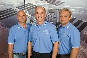 - (1) — цифра в скобках показывает число законченных космических полётов, включая этот, которые уже совершил данный член экипажа.