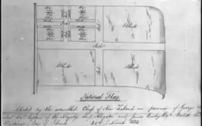 Флаг был частично основан на Георгиевском кресте, который уже использовался Церковным миссионерским обществом, с кантом с меньшим красным крестом на синем фоне, сверкающим чёрным, и с белой восьмиконечной звездой в каждой четверти[16]. В официальном описании, опубликованном в Новом Южном Уэльсе в августе 1835 года, не упоминалось о фимбрировании или количестве точек на звёздах[17]. Описание гласило: «Красный Георгиевский крест на белом фоне. В первой четверти красный Георгиевский крест на синем фоне, пронзенный четырьмя белыми звёздами»[18]. Эта версия флага фактически служила национальным флагом Новой Зеландии с 1835 года до подписания Договора Вайтанги в феврале 1840 года[19], хотя флаг Объединённых племён продолжал использоваться в качестве флага Новой Зеландии после заключения Договора, например, флаг на медалях, вручённых солдатам, участвовавшим в войне в Южной Африке (1899—1902 годы)[20].