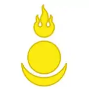 - Ниже огня на эмблеме представлены солнце и луна — древние тотемы монголов, символизирующие свет и вечность. Старинное предание так говорит об этом: «Народ монгольский, чей отец — молодой месяц, а мать — золотое солнце».