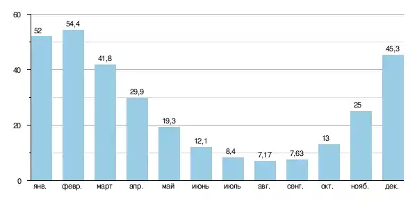 Случаются сезонные изменения скорости расхода воды с 41 до 55 м³/с с декабря по март включительно (с максимумом в январе-феврале). Летом с июня по октябрь скорость расхода может понижаться до 7,17 м³/с (в августе).[2]