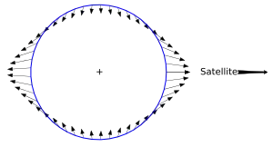 Четыре объекта (обозначены на схеме зелёными точками) движутся в гравитационном поле[4] по направлению к центру небесного тела. В соответствии с законом обратных квадратов, ближайший к небесному телу объект испытывает наибольшее ускорение, и если представить все четыре объекта частями одного, более крупного объекта, то очевидно, что он будет деформироваться за счёт приливных сил, и при соответствующей величине этих сил будет либо разорван, либо «вытянут».