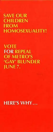 Стратегия кампании состояла главным образом в том, чтобы изобразить гомосексуалов аморальными и неприличными и продвинуть идею, что их нужно остановить, потому что они хотят извратить детей. Коалиция была очень хорошо организована и получила поддержку со стороны консервативно настроенных христианских групп по всей стране, таких как «Moral majority» во главе с проповедником Джерри Фолуэллом и политическими деятелями республиканской партии, такими, как сенатор Джесси Хелмс[6].