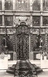 А покрыта та соборная церковь закамарины все чешуею, а средина тесом на четыре стороны, а меж закамаринами и по углам учинены прорезные виски, и те все виски выкрашены красками из масла. С приходу у тоя соборныя церкви, с западную страну, учинен притвор каменный со своды… С южной и северной стороны, вместо крылец, построены притворы каменные, со своды каменными же. Их притворов в храм врата церковныя с ротесками изрядными, разными образцы учинены, выписаны краски их масла узорочно. В тех вратах двойные затворы: столярнаго художества, сверху до половины слюдныя в кругах с крестами и каймы золочеными и железные с веригами и замками, изряднаго дела, выписаны краски узорочно, многовидными вертоградными травы различно. Иконостас сницорскаго и флямованнаго столярнаго добраго самаго художества был вызолочен красным золотом весьма узорочно.