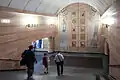 В октябре 2013 года в наземном вестибюле было уложено пять мозаичных панно, на котором изображена жизнь Сенной площади в XIX веке — собор Спас-на-Сенной, представители купечества, знаменитые русские писатели и герои их произведений[6][7][8]. Для создания панно использовано две тонны смальты[8].