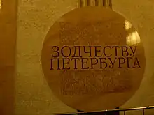 Напротив выхода в город находится памятный знак «Зодчеству Петербурга», представляющий собой круглый медальон, на котором выбиты фамилии выдающихся архитекторов города, однако в нём содержатся ошибки: «Деламот» вместо Валлен-Деламот (фр. Jean-Baptiste Vallin de la Mothe), «Детомон» вместо Тома де Томон (фр. Jean-François Thomas de Thomon), фамилия архитектора Огюста Монферрана (фр. Henri Louis Auguste Ricard de Montferrand), автора Исаакиевского собора, написана с одной «р». Отсутствует какой-либо порядок при упоминании династий зодчих: братья Косяковы — «Косяковы», в то время, как архитекторы Шарлемани (отец и два сына) — «Бр. Шарлемани», фамилия братьев Квасовых (Андрея и Алексея) внесена в список в единственном числе. Николай Бенуа и его сын Леонтий Бенуа так же, как И. А. Фомин и сын И. И. Фомин, записаны отдельно, причём инициалы Бенуа стоят перед фамилиями, а Фоминых — после; фамилии архитекторов Китнеров и Шаубов — в единственном числе[5].