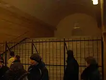 «Середина» станции. Левая зелёная стрелка, предназначенная указывать направление на выход в случае отключения основного освещения, указывает на переход к «Сенной площади», правая — к «Садовой»[38]