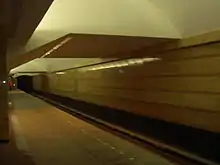 Название станции на стене. Буквы почти не выделяются на фоне стены, имеющей тот же цвет[10].