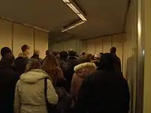 Узкая платформа полностью заполнена пассажирами, ожидающими прибытия поезда.