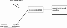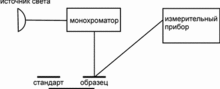 На рисунках приведены две основные схемы спектрофотометров, измеряющих спектральный апертурный коэффициент отражения образца относительно рабочего стандарта с известной спектральной характеристикой. Возможно помещение монохроматора в пучок отраженного света от образца или стандарта или освещение образца и стандарта монохроматическим излучением после монохроматора.