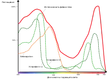 Спектр действия фотосинтеза типичного фотосинтезирующего организма по форме повторяет суммированные спектры поглощения его основных (хлорофиллы, бактериохлорофиллы) и вспомогательных пигментов (каротиноиды, фикобилины)[2].