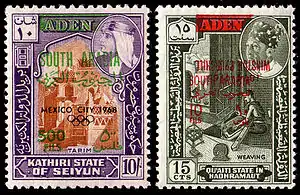 Известен пример, когда после деколонизации Южного Йемена в 1968 году на марках различных султанатов протектората Аден британских времён были сделаны одновременно 16 надпечаток в различных сочетаниях — текста «Южная Аравия», изменённых номиналов в новой валюте, пять олимпийских колец к Олимпиаде в Мехико и остальным Олимпийским играм, начиная с берлинских, а также имя Уинстона Черчилля в нормальном и перевёрнутом виде, с годами его жизни и без (cм. иллюстрацию справа[≡]).