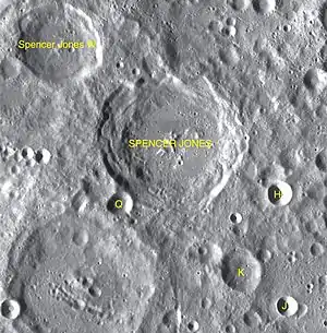 ![]() Снимок зонда Lunar Rec. Кратер Спенсер Джонс в центре, в нижней левой части снимка – кратер Папалекси. | |