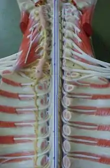 Спинно́й мозг (лат. medulla spinalis) — орган центральной нервной системы позвоночных, расположенный в позвоночном канале[1]. Принято считать, что граница между спинным и головным мозгом проходит на уровне перекреста пирамидных волокон (хотя эта граница весьма условна) или на уровне затылочного отверстия затылочной кости. Внутри спинного мозга имеется полость, называемая центральным каналом (лат. canalis centralis) который заполнен спинномозговой жидкостью. Спинной мозг защищён мягкой, паутинной и твёрдой мозговой оболочкой. Пространства между оболочками и спинномозговым каналом заполнены спинномозговой жидкостью. Твёрдая мозговая оболочка состоит из висцерального и париетального отдела. Пространство между висцеральной и париетальной твердыми мозговыми оболочками называется эпидуральным пространством и заполнено жировой тканью и венозной сетью.