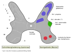 Отдельные участки серого вещества спинного мозга значительно отличаются друг от друга по составу нейронов, нервных волокон и нейроглии[4].