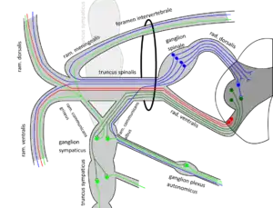 Передний и задний корешки одного уровня и одной стороны тотчас снаружи от спинномозгового узла соединяются, образуя спинномозговой нерв (лат. n. spinalis), который является, таким образом, смешанным. Каждая пара спинномозговых нервов (правый и левый) соответствует определённому участку — сегменту — спинного мозга[2].