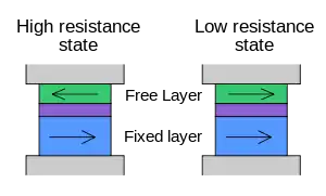 Передача спина зависит от выравнивания магнитных моментов в ферромагнетиках. Если ток проходит в ферромагнетик с основным спином «вверх», например, электроны со спином вверх будут проходить через границу относительно беспрепятственно, а электроны со спином «вниз» - отражаться или, при перевороте спина на границе ферромагнетика, чтобы попасть на незаполненное состояние. Таким образом, если оба - фиксированный и свободный слои - поляризованы в одном направлении, устройство имеет относительно низкое электрическое сопротивление, а если под воздействием магнитного поля меняется полярность свободного слоя, то устройство имеет повышенное сопротивление за счет дополнительной энергии, необходимой для рассеяния спина в другое состояние.