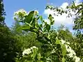 Соцветия — многоцветковые зонтиковидные кисти из белых цветков[2].