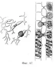 Вот микроскопическая водоросль, уже нам знакомая спирогира, с её характеристическими спиральными лентами хлорофилла. В известный момент развития этого организма составляющие его нити принимают параллельное положение, как это видно на рисунке. В некоторых клетках содержимое собирается в круглые или овальные клубки, и в то же время на двух смежных клеточках образуются вздутия стенки. Эти бугорки растут навстречу, сталкиваются, разделяющая их перегородка всасывается, исчезает, и тогда содержимое двух клеточек сливается в одну массу, причем совершенно безразлично, перельется ли содержимое из левой нити в правую или наоборот. Образовавшаяся таким образом округлая масса получает оболочку и превращается в спору, которая, освободившись, может прорасти и дать начало новому организму, новой нити спирогиры. Здесь мы, следовательно, встречаем процесс оплодотворения в крайне простой форме: две клеточки сливаются, чтобы дать начало одной, которая и служит для воспроизведения организма.