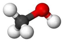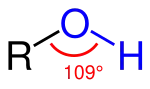 Молекулы спиртов, подобно молекуле воды, имеют угловое строение. Угол R−O−H в молекуле метанола равен 108,5°[55]. Атом кислорода гидроксильной группы находится в состоянии sp³-гибридизации. Спирты имеют существенно более высокие температуры плавления и кипения, чем можно было бы предполагать на основании физических свойств родственных соединений. Так, из ряда монозамещённых производных метана, метанол имеет необычно высокую температуру кипения, несмотря на относительно небольшую молекулярную массу[56]: