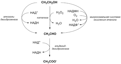 Среди низших спиртов с точки зрения физиологии наибольший интерес представляет, несомненно, этанол. В организме человека этанол является естественным метаболитом и в норме присутствует в крови в очень низких концентрациях. Также этанол может поступать в организм с пищей. Этанол в организме человека метаболизируется преимущественно в печени. Под действием цитозольного фермента алкогольдегидрогеназы этанол окисляется в ацетальдегид, который далее перерабатывается митохондриальной альдегиддегидрогеназой в ацетат. Ацетат после активации короткоцепочечной ацил-коэнзим А-синтетазой может далее разрушаться в цикле Кребса[45]. В утилизации этанола второстепенную роль играет также микросомальная этанол-окисляющая система, представленная цитохромом P450 и каталазой[39]. При высокой концентрации алкоголя в крови ферменты не справляются с оксилением ацетальдегида до ацетата, и в организме происходит накопление ацетальдегида, который в 10—30 раз токсичнее этанола[46], за счёт чего происходит отравление организма, т. н. похмелье. По энергетической ценности для организма этанол (7 ккал/г) занимает промежуточное положение между углеводами (4,1 ккал/г) и жирами (9,3 ккал/г). Вклад этанола в общую калорийность пищи у не страдающих алкоголизмом взрослых людей может достигать 12 %. Однако потребление этанола в качестве пищевого продукта и источника энергии имеет ряд недостатков с биохимической точки зрения. Кроме образования токсичного ацетальдегида, к таким недостаткам следует причислить тот факт, что избыточные калории, поступившие в организм в форме этанола, могут запасаться только в жирах, так как возможность преобразования этанола в углеводы в организме человека отсутствует[45]. Кроме того, этанол нарушает другие метаболические процессы: ингибирует глюконеогенез (это является причиной гипогликемии при приёме больших доз алкоголя), ускоряет производство цитокинов, изменяет концентрацию гормонов[47]. Алкогольные напитки содержат очень мало витаминов и минеральных веществ, что также может оказать негативное влияние на здоровье. Также пищевой этанол сам по себе намного дороже, чем энергетически эквивалентное количество сахара[45].