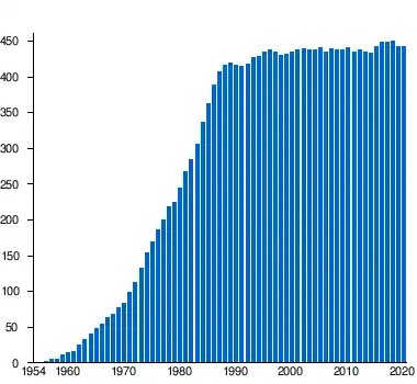 В настоящее время (октябрь 2021 года) в 32 странах мира эксплуатируется 437 ядерных реактора (энергоблока), общей электрической мощностью 394,5 ТВт[3]. 51 энергоблок находится на стадии строительства, 201 энергоблок закрыт[4][5].