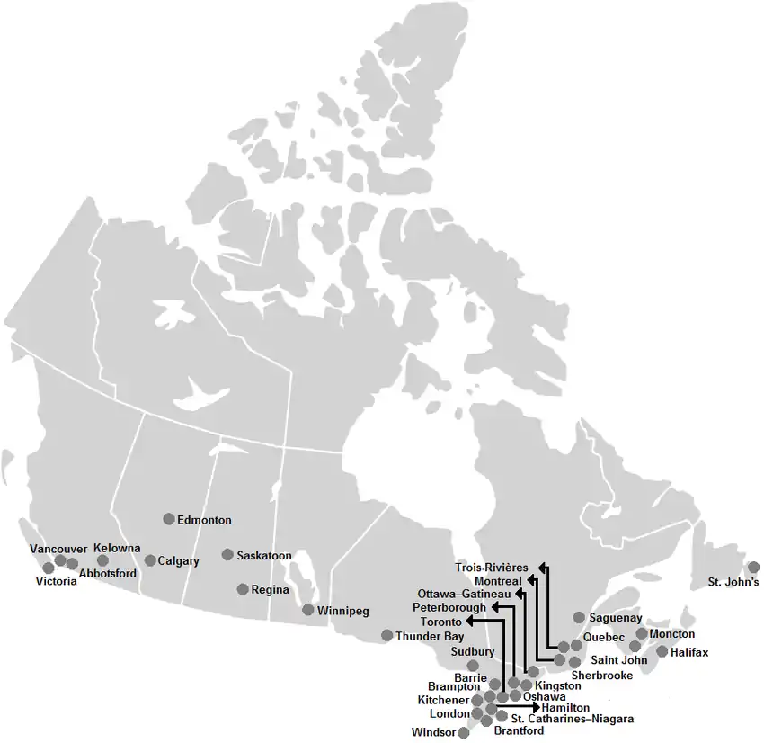 | 47 | 43 | Су-Сент-Мари | Онтарио | ПА | 82 691 | 82 809 | 82 450 | 80 681 | 81 238 | -1,8% |