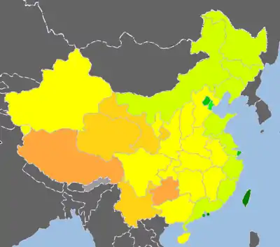 Составной список, созданный в рамках программы развития ООН для примерной оценки индекса человеческого развития населения по всем административным делениям Китайской Народной Республики, включая все провинции, автономные районы и муниципалитеты. По результатам исследования становится ясно, что в Китае существует сильный разрыв по качеству жизни в различных регионах, в частности, если уровень жизни в крупнейших городах и некоторых регионах сопоставим с Европой, то беднейшие регионы сопоставимы с африканскими странами. Наиболее благополучные регионы расположены на границе России, Кореи, Восточно- и Южно-китайском морях, в то время как центральные и западные регионы менее благополучны.