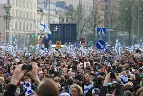 Жители Хельсинки празднуют победу сборной Финляндии на Чемпионате мира по хоккею 2011. Песни, звучавшие во время него, были изданы на сборнике Leijonat 2011, который два месяца удерживал вершину финского хит-парада.